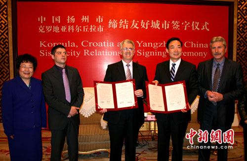 中新網(wǎng)揚(yáng)州4月17日電(記者 崔佳明)16日,克羅地亞科爾丘拉市副市長(zhǎng)弗蘭克•斯蒂奈克率團(tuán)訪問揚(yáng)州,當(dāng)晚,揚(yáng)州市副市長(zhǎng)聞道才和弗蘭克•斯蒂奈克副市長(zhǎng)在揚(yáng)州迎賓館分別代表兩市簽訂協(xié)議,雙方正式締結(jié)為友好城市。
