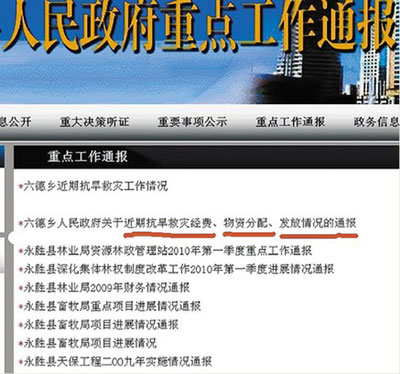 打開麗江市、縣政務(wù)網(wǎng),記者發(fā)現(xiàn)永勝縣六德鄉(xiāng)政府一份看似不起眼的“通報(bào)”,該通報(bào)也是目前記者在麗江“網(wǎng)絡(luò)問政”過程中發(fā)現(xiàn)的麗江市鄉(xiāng)級政府相關(guān)抗旱救災(zāi)款物流向通過政務(wù)網(wǎng)向社會公開唯一鄉(xiāng)政府。