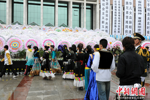 10時15分開始,現場民眾排隊向地震遇難者敬獻鮮花,哀樂響起,來自西寧虎臺中學的孩子們久久不愿離去。學生們一遍又一遍地唱響國歌,一次又一次地喊起“青海加油!玉樹加油!”