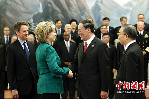 中新網(wǎng)北京5月24日電(記者 張蔚然)第二輪中美戰(zhàn)略與經(jīng)濟(jì)對話開幕式今天上午9時(shí)許在人民大會堂舉行。中國國務(wù)院副總理王岐山、國務(wù)委員戴秉國、美國國務(wù)卿克林頓、財(cái)政部長蓋特納出席。