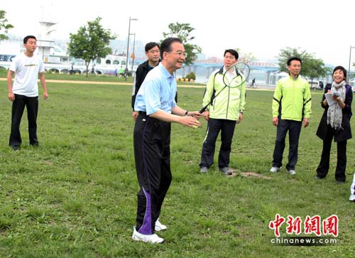 同四人道別后,溫家寶繼續繞著草坪跑步。跑了兩圈后,他看到草坪上有人在打羽毛球,便走上前去。兩名正在打球的青年男子認出了溫家寶,迎過來向他問好。其中一人將自己的羽毛球拍讓給溫家寶,溫家寶與另外一人進行了一場“友誼賽”。