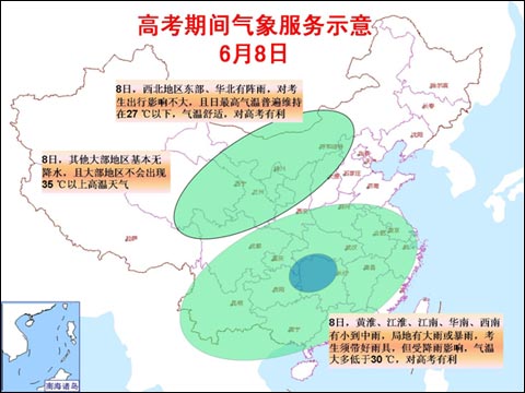 王秀文說:“前段時間,南方部分地區因暴雨受災較為嚴重,已經給當地考生備考帶來一定影響。高考期間,我國仍會出現范圍比較廣的降雨天氣,西北地區東部、華北、青藏高原東部、四川盆地以及云南等地將多陣雨;江漢、江南、華南及貴州等地將出現較強降雨過程,并伴有短時雷雨大風。提醒考生提前關注天氣變化,提早做好出行準備,確保準時到達考場。”