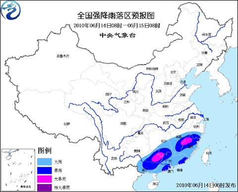 預(yù)計(jì),6月14日08時(shí)到6月15日08時(shí),湖南南部、江西中南部、浙江南部、福建大部、廣東大部、廣西大部等地有大到暴雨,其中,廣西東北部、湖南東南部、江西中部偏東地區(qū)、福建西北部等地的局部地區(qū)有大暴雨,上述部分地區(qū)并伴有短時(shí)雷雨大風(fēng)或冰雹等強(qiáng)對(duì)流天氣。