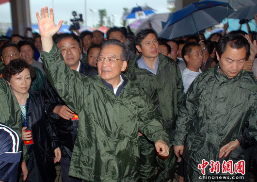 在羅針鎮,溫家寶冒雨在羅針鎮高速公路的羅針收費站下車,直接到了險情的岸邊,慰問現場搶險的人員。他和搶險的武警官兵親切握手,并即興發表了講話。