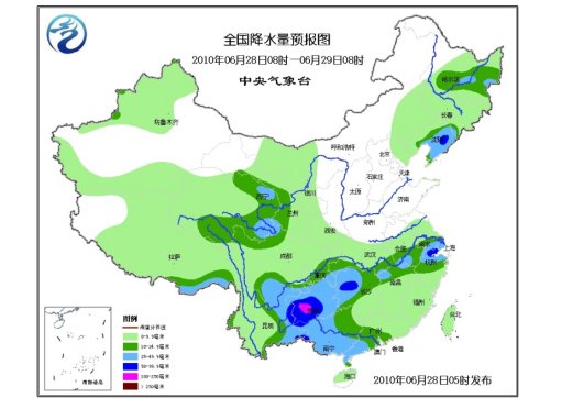 28日08時至29日08時,西藏大部、青海有小到中雨或雨夾雪,新疆西北部和南部山區、甘肅大部、寧夏、陜西南部、內蒙古西部偏西地區和東南部、東北地區大部、河北東北部、江淮、江漢、江南、華南大部以及西南地區有小到中雨或陣雨,其中,西藏東南部、青海東部、甘肅西南部、黑龍江中部偏東地區、遼寧中東部、川西高原南部、云南東部、貴州大部、重慶東南部、湖南西部、廣西西部和南部、廣東西南部、江西北部、蘇皖南部、上海、浙江北部等地的部分地區有大雨、局地暴雨,貴州西部的局部地區有大暴雨;上述部分地區并伴有短時雷雨大風等強對流天氣。新疆西部和北部、甘肅西部、內蒙古中東部等地有4~6級風,其中,新疆山口地區風力可達8~9級。東海大部海域有5~6級西南風。