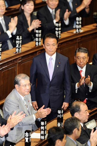 24日當地時間13點30分,兩天前剛剛當選自民黨總裁的麻生太郎在眾議院全體會議上以337票被指定為第92任日本總理大臣。
