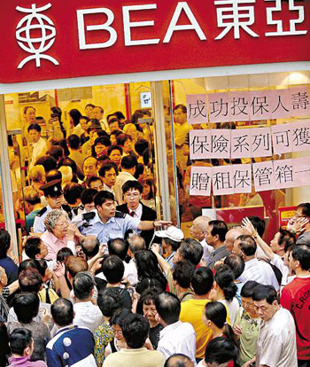 東亞銀行上周三受到不利謠言影響,港九多家分行出現排隊提款人龍。東亞銀行為了加強市民信心,當日更特別延長服務時間半小時。該行管理層強調,東亞銀行有足夠資金應付市民提款,而被提走的存款金額,相對該行所預備的金額只占很少數目。