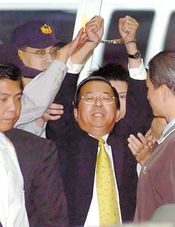 下午四點三十分陳水扁在走下特偵組時樓梯口,他收起不安的情緒高舉雙手,向媒體秀出上銬的雙手,大喊“政治迫害”、“司法冤獄”,并連續喊了兩次“臺灣加油”后,匆匆坐上特偵組公務車,直奔臺北地院。