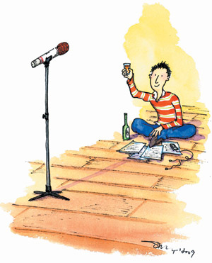 我深呼吸了一下,故作鎮定出場,還不時面露快要僵掉了的微笑,以顯出大將之風。使出一百二十分的濃情,努力回想電影《藍宇》中的感人情節,賣力演唱《你怎么舍得我難過》。曾看過歌星蔡依林或周杰倫在演唱會時,神色自若走來走去,與臺下觀眾互動。我自以為對歌詞已了如指掌,越唱越來勁,便也依樣畫葫蘆離開有歌詞的小熒光幕,邊走邊唱學大歌星模樣,顧盼生姿。