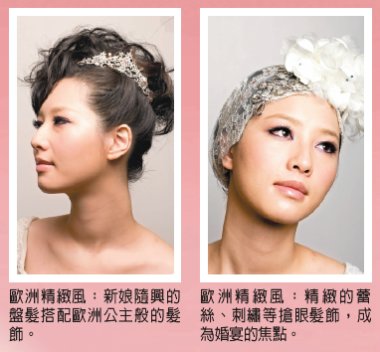 今年時尚界有許多飾品設計師出頭,在秀場上常見搭配夸張飾品的造型。怕麻煩的新娘,在發型上可以盡量簡單,只要更換不同的華麗發飾,就可以變出多樣風格,尤其適合拍婚紗照或宴客中場短時間換裝時使用。