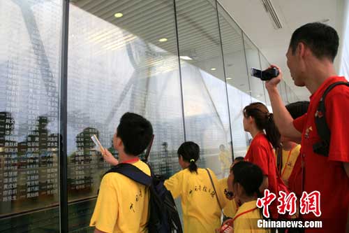 27日下午,參加“2010年海外華裔及港澳臺(tái)地區(qū)青少年‘中國(guó)尋根之旅’夏令營(yíng)”的6000余名華裔青少年一同參觀了“鳥巢”和“水立方”。他們中很多營(yíng)員的父母或親朋好友曾為“水立方”的建設(shè)捐款,姓名被刻在“水立方”的留名廊上。