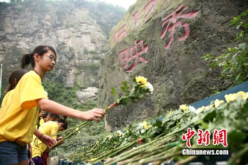 中新網(wǎng)成都7月31日電 (徐楊祎 張浪)31日,來自歐美大陸的170多位海外華裔青少年,前往“5·12汶川地震”震中映秀鎮(zhèn),參觀地震遺址,寄托哀思。在地震飛來石祭臺(tái),同學(xué)們自發(fā)購買鮮花,深切哀悼在地震中不幸遇難的同胞們。