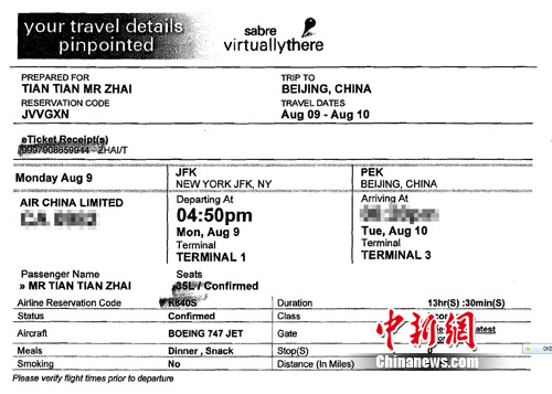 據了解,翟田田所乘坐的從紐約肯尼迪國際機場直飛中國北京的航班,將于10日下午抵達北京,屆時翟田田的親友將在北京接機。(完)
