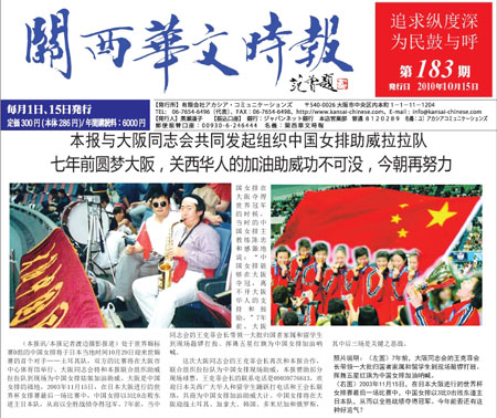 大阪是中國女排的福地,2003年11月15日,在日本大阪進行的世界杯女排賽最后一場比賽中,中國女排以3比0擊敗東道主日本隊,從而以全勝戰績奪得冠軍。7年前,當中國女排在大阪奪得世界冠軍的時候,當時的中國女排主教練陳忠和感激地說:“中國女排能夠在大阪奪冠,離不開大阪華人的支持和鼓勵。”7年前,大阪同志會的王克菲會長帶領一大批華僑華人和留學生到現場敲鑼打鼓、揮舞五星紅旗為中國女排加油吶喊。