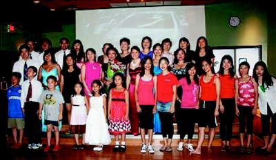 圣路易現代中校暑期聲樂及舞蹈班演出學員在會后和老師閻明(二排左五)合影。(金能爾∕攝影)