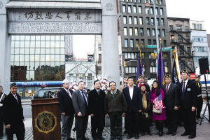 下午,紐約華裔美國退伍軍人會在華埠華裔軍人忠烈坊舉行另一個紀念儀式--向華裔軍人獻上花圈,呼吁人們勿忘華裔軍人對美國作出的貢獻。