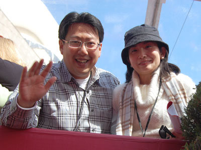 華裔吳玉婷(右)和丈夫成為紅地毯旁的幸運觀眾,他們最希望看到喬治庫隆尼出現在紅地毯上。 (美國《世界日報》/何方攝影)