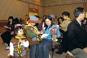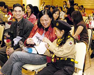 與丈夫史文山在教國(guó)際標(biāo)準(zhǔn)舞的沈柏容,在看到9歲的女兒史洛謙,送了張印有一個(gè)大大“孝”字的卡片和一大花束康乃馨時(shí),笑得合不攏嘴。佛光童軍小兄妹譚明駿和譚明麗,也各送了張“孝”卡給媽媽王淑芬。王淑芬說(shuō),能在佛光山收到子女的愛(ài)心卡和康乃馨,很有意義。