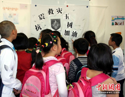 周六下午,是孩子們常規(guī)上中文課的時(shí)間。下課的鈴聲一響,孩子們就把自己的零用錢裝進(jìn)信封,一個(gè)接一個(gè)地放進(jìn)捐款箱,然后在寫(xiě)著"抗震救災(zāi) 玉樹(shù)加油"的橫幅上寫(xiě)下自己的名字,有些會(huì)寫(xiě)中文的孩子還寫(xiě)上了“加油”二字。一筆筆稚嫩的筆跡代表著一份份純真的愛(ài)心。