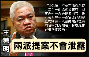 中新網(wǎng)9月9日電 據(jù)馬來西亞《星洲日報》報道,馬華總秘書王茀明8日說,他保證不會在兩派就特大二合一的協(xié)調(diào)會議前,泄露任何一派的提案內(nèi)容,甚至允許另一派竄改已經(jīng)提呈的議案,或暴露兩派提案內(nèi)容給對方知道。
