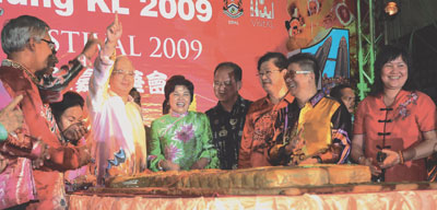 納吉(左四)偕同眾嘉賓,切下大會精心炮制重達80公斤的“一個馬來西亞”月餅,與全民歡呼“一個馬來西亞”口號,為這項被列為旅游部年度特定節目的中秋嘉年華會掀開序幕。右二起為洪細弟、右四起為姚長祿及黃燕燕。