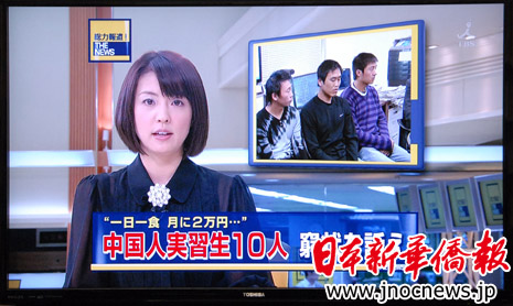 中新網(wǎng)1月8日電 據(jù)日本新華僑報(bào)網(wǎng)報(bào)道,在中日兩國引起強(qiáng)烈反響的十名在日中國實(shí)習(xí)生“討薪事件”也引起了日本媒體的關(guān)注。1月7日,日本主流媒體TBS電視臺(tái)兵分三路,一路前往十名中國實(shí)習(xí)生的駐在地采訪,一路找到中國實(shí)習(xí)生所在的“健陽”株式會(huì)社社長宮地聰采訪,一路找到在《日本新華僑報(bào)》社舉行記者會(huì)見的十名中國實(shí)習(xí)生采訪。當(dāng)天晚上7點(diǎn)半鐘,TBS電視臺(tái)在黃金時(shí)間段播出這條新聞,引起很大反響。