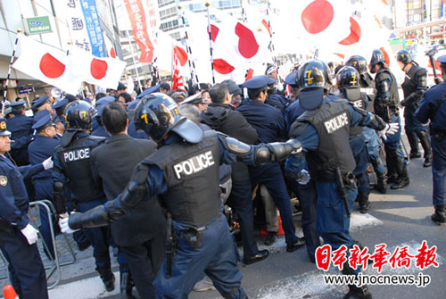 當他們在警崗前叫嚷結束后,準備前往“陽光城”物產店前騷擾搗亂。這個時候,警方機動隊一擁而上,將他們團團圍住,并且在四周設立了鐵欄障礙。他們發瘋般狂喊口號,做著“突圍”的動作。警方機動隊絲毫不為所動。一輛寫著“以恢復主權為目標之會”的面包車開了過來,跳下一個小頭目高喊:“我們去池袋警察署抗議!我們申請后拿到了許可,為什么不允許我們去?”然后,他們分散陸續前往池袋警察署。