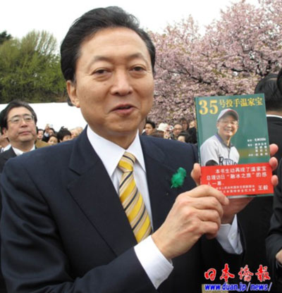 在“賞櫻會(huì)”上,受邀參加的日本僑報(bào)社張景子社長向鳩山首相贈(zèng)送了該社出版的《35號(hào)投手溫家寶》,鳩山首相欣然收下,并勉勵(lì)日本僑報(bào)社繼續(xù)為日中交流做貢獻(xiàn)。張景子說,“我們來自中國,在日本創(chuàng)辦的日本僑報(bào)出版社致力于日中交流,已經(jīng)出版了200來本書。2008年出版了中日文版《35號(hào)投手溫家寶》,今天特地給您帶來了一本。”鳩山首相高興地從張景子手中接過《35號(hào)投手溫家寶》一書,仔細(xì)端詳,并說:“我下個(gè)月就要與溫家寶總理會(huì)面。希望你們繼續(xù)努力,為促進(jìn)日中交流作出更大的貢獻(xiàn)。”說完,鳩山首相高高地舉起《35號(hào)投手溫家寶》一書,讓大家拍照。