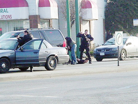 而另一名拘捕疑犯的現場位于東南海旁大道(S.E. Marine Dr.)夾緬街(Main St.),該處油站便利店東主Jason表示,十字路口附近一輛白色Audi多用途越野車,被7輛包括無標記警車包圍。