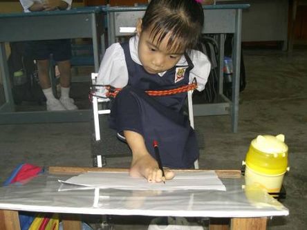 天天這樣寫,因腳骨沒力,有時寫得看不見字跡,媽媽就換了色澤較黑的鉛筆給她,約幾個月后終于可用腳寫出像樣的字。