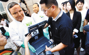昨天(25日),三位國際環保組織綠色和平的志愿者出現在惠普中國總部門前,每人手捧一部帶有“毒”字樣的惠普筆記本電腦。綠色環保一位負責人表示,由于惠普推遲其承諾的在產品中消除兩種有毒物質的時間,因此用這種方式勸惠普“戒毒”。