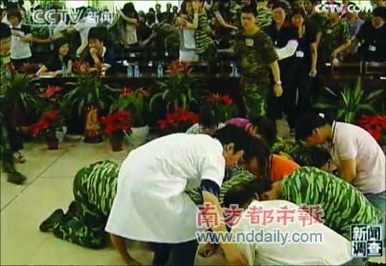 當著《新聞調查》節目組的面,楊永信在一次點評課后接受了十幾名接受治療的孩子及其家長的跪拜感謝,楊永信稱這樣的場景讓他很激動,覺得自己的付出值了。