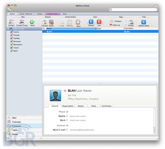 與微軟Office 2010的外觀非常相似,Office 2011 for Mac在一個應(yīng)用程序上都包括這個絲帶。這是微軟首次在用于Mac機的Office套裝軟件中提供Outlook程序。用于Windows和Mac機的Outlook軟件的外觀是一樣的,包括郵件預(yù)覽框、日歷、聯(lián)絡(luò)人、任務(wù)和備注等。
