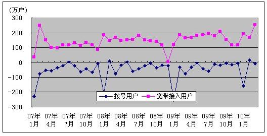 中新網(wǎng)4月26日電 據(jù)工信部今日公布的《2010年3月通信業(yè)運(yùn)行狀況及主要指標(biāo)完成情況》顯示,截止第一季度,基礎(chǔ)電信企業(yè)互聯(lián)網(wǎng)寬帶接入用戶凈增610.5萬戶,達(dá)到10933.1萬戶,而互聯(lián)網(wǎng)撥號用戶減少了152.0萬戶。基礎(chǔ)電信企業(yè)的互聯(lián)網(wǎng)用戶進(jìn)一步趨向?qū)拵Щ?table border=0 cellspacing=0 cellpadding=0 align=left>