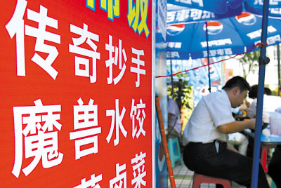 昨日上午,記者找到了位于萬(wàn)豪酒店對(duì)面的“傳奇抄手”。這是一個(gè)臨街的小店面,面積有10平米左右。店面一旁,“傳奇抄手”四個(gè)大字赫然印于招牌上。如果說(shuō),“傳奇”算是比較普遍的詞匯,那“魔獸水餃”、“屠龍刀削”的取名,則肯定令玩家們耳熟能詳。