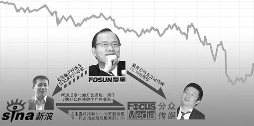 呂伯望給記者粗算了一下,復(fù)星國際在分眾傳媒中13.33%的股權(quán),如果換到增發(fā)后的新浪,也就能拿到5%左右的股權(quán),而在此前,連掌握了新浪18%股權(quán)的盛大CEO陳天橋都沒能進(jìn)入新浪董事會。