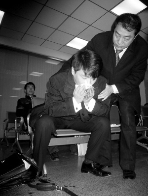 黃靜的代理人周成宇和代理律師付占平一起來到朝陽法院,向法院遞交向華碩討名譽權索賠100萬的立案申請,在排號機上取號后,周成宇與律師進入受理大廳等候。就在眾人等待之時,剛才還在與律師交談的周成宇突然口噴鮮血,令大廳內的人吃驚不已。有記者遞給周成宇紙巾,擦拭嘴上的血跡,在律師的攙扶下,周成宇坐下,幾次又出現嘔血的狀況。雖然他一直稱沒事,拒絕叫急救車,但臉色蒼白,拿著紙巾的手也不住地顫抖。