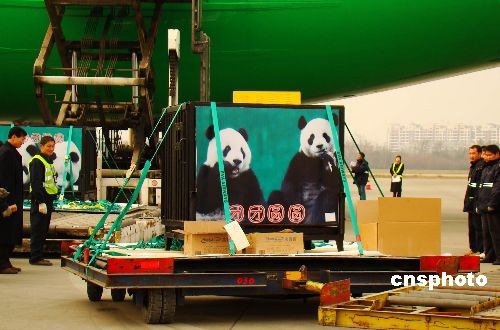12月23日13時40分,成都雙流國際機場,工作人員正將贈臺大熊貓“團團”“圓圓”運上臺灣長榮航空公司的載運專機。中新社發 霍潺 攝