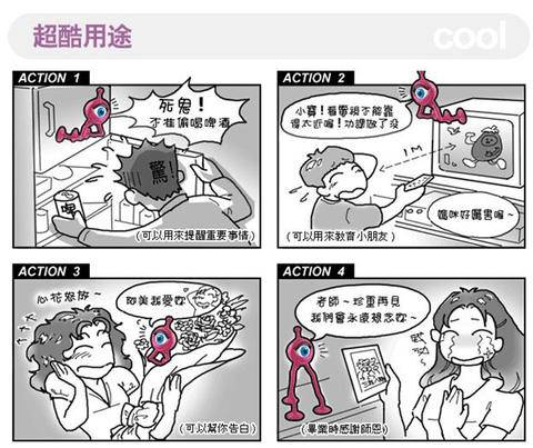 大大的眼睛、有三條帶吸盤的柔韌長腳,一幅外星人的模樣。初次見它可能會認為這不過是個造型有點另類的玩偶,其實它是個用途多多的留言機,兩個人之間浪漫的貼心的交流……靠它轉達別有一番樂趣。