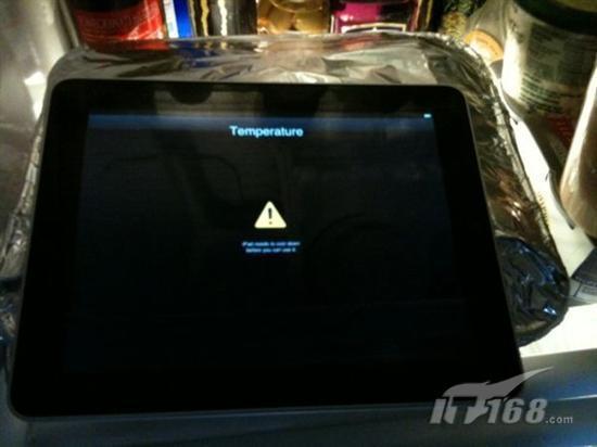 引自:“PC Magazine編輯Zach Honig在twtter” 他帶著他全新的iPad在紐約市出外曬太陽(前幾天紐約市的氣溫都超過攝氏20度左右),十分鐘后iPad就出現了“iPad需要降溫后才能使用”的信號然后關機。Honig把他的iPad放進冰箱中,然后幾分鐘后iPad就回復正常了。