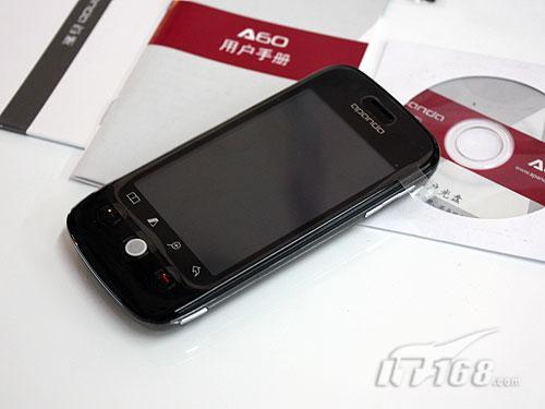 首派A60擁有黑白兩種配色,按鍵設計上可以說有些借鑒HTC生產的GPhone,除了常見的規矩球和通話、掛機鍵之外,屏幕下面的4個按鍵也是比較常見。屏幕為常規的3.2寸,所以116x57x12.4mm的三維尺寸也相當合適,是一款比較時尚輕薄的智能手機。該機還是一款3G手機,支持GSM/EDGA/WCDMA的2G/3G網絡連接,可以正常使用聯通的3G卡。不過遺憾的是并沒有配備前置攝像頭。