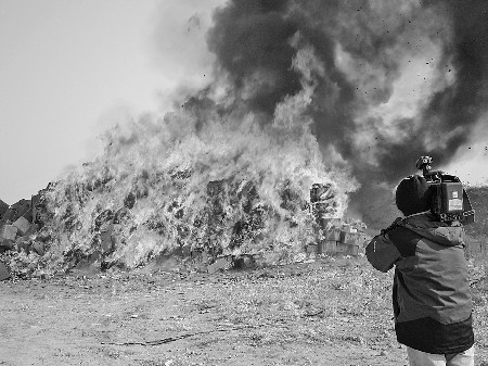 上午10:30左右,在經過假劣藥械移交銷毀簽字儀式之后,點火開始。出席現場會議的相關領導首先點燃火把,引燃了浸透柴油的“藥山”。火苗躥起幾十米高,熊熊的火焰頓時吞噬了數以萬計的偽劣藥械。熱浪掀起的滾滾濃煙中不時傳來響亮爆炸之聲,不少灌裝液、氣體藥瓶被炸得飛上了天。