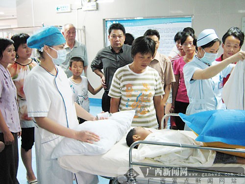 6月23日下午2時,記者趕到貴港市人民醫(yī)院時,正遇見自治區(qū)衛(wèi)生廳、教育廳的領(lǐng)導(dǎo)前來看望中毒的幼兒。在醫(yī)院外科樓二樓的重癥監(jiān)護(hù)室內(nèi),5名幼兒正在接受救治,其中3名病情較重。一名看起來只有四五歲的小孩口鼻插著導(dǎo)管,躺在床上不停地抽搐。醫(yī)生告訴記者,這名幼兒身體素質(zhì)較差,被送到醫(yī)院搶救后出現(xiàn)了血尿、高燒、肺水腫等癥狀,有病情加重的趨勢。后來,經(jīng)過搶救,病情得到緩解。