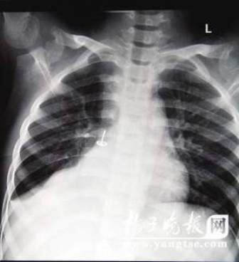 小杰的母親告訴記者,他們一家來自安徽明光,自己和孩子的父親都在外打工,小杰從小就由爺爺奶奶照顧。從去年夏天開始,爺爺奶奶就告訴他們,小孩身體不好,總是感冒咳嗽。后來發(fā)展到幾乎每隔一個星期,小杰就感冒發(fā)燒。從上個月中旬開始,小杰連著幾天發(fā)低燒,掛了幾天水都壓不下來,長輩們很擔(dān)心,就把小杰的媽媽喊回家里。小杰的媽媽想,孩子反復(fù)感冒也不是個事兒,于是就把他帶到南京,想找個專家好好看看。到了南京市兒童醫(yī)院,醫(yī)生詢問病史后,建議孩子做一個胸片看看。結(jié)果片子一出來,所有人都嚇了一跳,孩子的肺里有一個明顯的金屬物,看這形狀,不就是一個圖釘嗎!在家長的追問下,小杰才吞吞吐吐地說,去年3月的一天,他把圖釘含在嘴里面玩,結(jié)果一不小心就吸了下去。但是據(jù)孩子自述,就剛一開始有點疼,過了一會就沒有感覺了。因為怕被家長教訓(xùn),他一直沒敢吱聲。