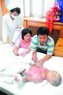 醫(yī)生告訴雷麗娟,孩子75%面積燒傷,無法痊愈,“你們花100萬也治不好,就算治好也有可能落下殘疾。”雷麗娟忍住心中的悲痛,撫摸著文龍身上重重包裹的白紗布說:“不管你變成什么樣,永遠(yuǎn)都是媽媽的寶貝!就算上街乞討,也要把你治好!”第二天,雷麗娟和丈夫帶著孩子先后來到長(zhǎng)沙的4所醫(yī)院,但求醫(yī)未果。今年8月中旬,經(jīng)人介紹,孩子被送進(jìn)解放軍163醫(yī)院燒傷整形·頜面外科中心,醫(yī)生確診其為“全身燒傷后疤痕攣縮畸形”。