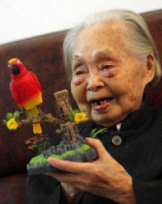 見到記者登門拜訪,老人笑呵呵站在門口招呼大家,一頭銀發收拾得整整齊齊,露出幾顆大牙,顯得十分可愛。走近老人的房間,既簡樸又整潔,一張床、一個書柜,床頭柜上擺放的一些兒童玩具讓這家屋子頓生童趣。老人的女兒李金秀拿著一個電動鸚鵡告訴記者,這是“六一”兒童節那天子女們送給老人的一份特殊禮物。鸚鵡能說會叫,老人每天都會拿出鸚鵡擺弄幾下,自己一個人樂個不停!袄闲±闲,一點不錯。老人童心未泯,愛上兒童玩具,真是越活越年輕了!”李金秀說。老人說,自己的長壽秘訣就是保持一顆童心。