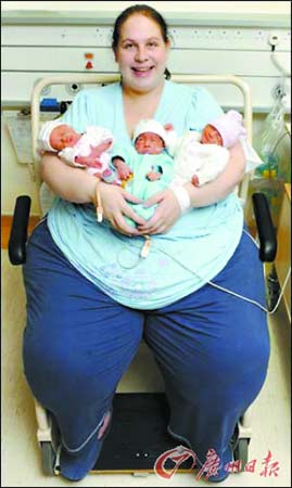 英國考文垂市體重達254公斤的產(chǎn)婦麗恩·索特近日成為全球最肥胖的三胞胎媽媽。她冒著極高的風險,在68名醫(yī)務人員助陣下奇跡般地剖腹產(chǎn)下3個健康寶寶,并承諾為了照顧子女要減肥。