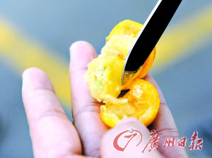 記者根據(jù)龔先生的引導(dǎo),在石溪南約東街附近懷疑有問題的水果檔花2.5元買了25個(gè)金橘,一個(gè)一個(gè)剝開來后,發(fā)現(xiàn)總共15個(gè)里頭是有蛆的。蛆蟲呈米色,只有不到1厘米長,大都藏在果肉里頭,打開果皮后還能看到它在蠕動(dòng)。有蛆的金橘摸上去都很軟,里頭的果肉組織往往被蟲蛀成一條條小通道。這種蛆金橘個(gè)頭比較小,有別于之前報(bào)道的曾發(fā)現(xiàn)蛆蟲的那種大柑橘。