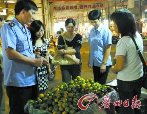 三水工商局在接到閔小姐情況反映后,立即派出工作人員及市場管理人員到該水果檔進行調查,并由市場管理人員將該水果檔正在出售的一堆橘子拿到農業部門送檢,等待檢驗結果再作進一步處理。