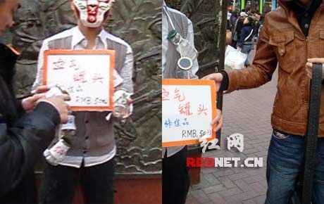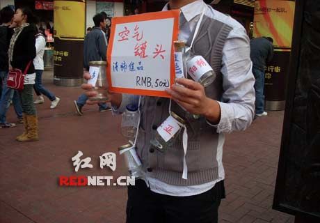 “發(fā)寶氣的吧?太扯淡了,竟然叫賣空氣!”23日傍晚,網(wǎng)友“閃賞”在紅網(wǎng)論壇發(fā)帖爆料,稱自己當(dāng)天下午在長(zhǎng)沙黃興路步行街逛街,在黃興銅像旁看到一男子臉上戴著面具,全身掛滿了寫(xiě)著陽(yáng)朔、三亞、可可西里、九寨溝字樣的玻璃瓶,手舉“空氣罐頭,50元”的紙牌,引來(lái)不少人圍觀。男子自稱空氣是從全國(guó)各地方收集來(lái)的,屬他勞動(dòng)成果,所以他有理由出售而贏利。